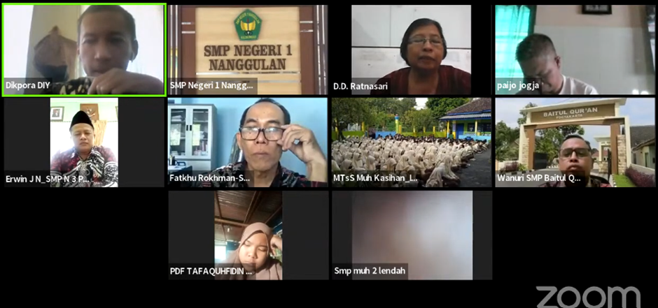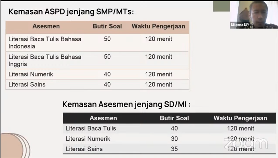 Yogyakarta (12/05/2023)- Melalui aplikasi Zoom Dinas Pendidikan, Pemuda dan Olahraga (Disdikpora) Daerah Istimewa Yogyakarta (DIY) melaksanakan kegiatan Sosialisasi Persiapan ASPD atau Asesmen Standardisasi Pendidikan Daerah. Sosialisasi yang ditujukan kepada Sekolah jenjang SMP/MTs, Paket B/PKPPS Wustha di Daerah Istimewa Yogyakarta ini merupakan salah satu tahapan sebelum dimulainya ASPD pada bulan Mei 2023.