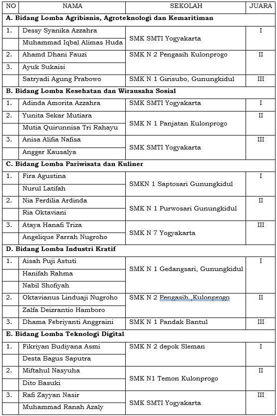 Selanjutnya para Juara I pada masing-masing bidang lomba berhak mewakili sebagai peserta Tingkat Nasional dari Dinas Pendidikan Pemuda dan Olahraga Daerah Istimewa Yogyakarta Tahun 2023. Berikut daftar Juara pada masing-masing lomba: